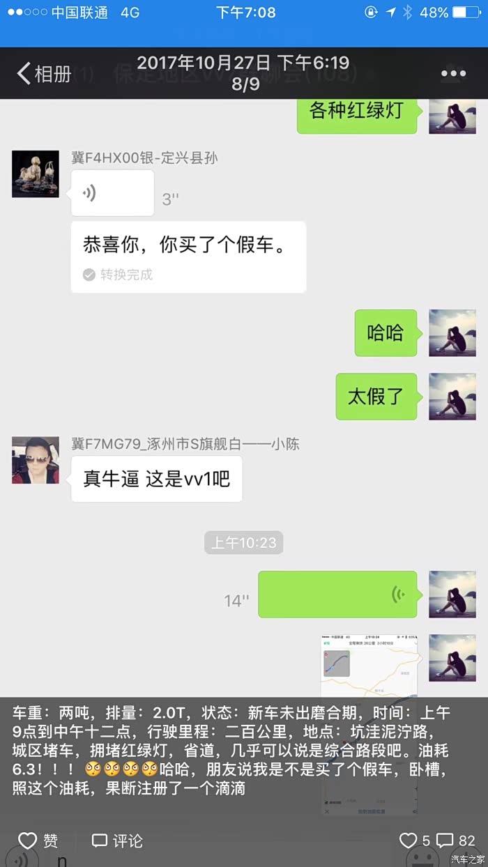 进来的人估计很多人会喷我,认为我是拖,没事,爱咋咋地吧,因为我说我综合油耗八到九个我现实朋友都不相信,我们保定v7俱乐部的人也不相信。其实,我也觉得那天那个表显6.3有些不可思议,后来我上高速匀速100迈表显还7.5个油呢,现在用节能模式,市区综合油耗表显7到8个,实际油耗9个。