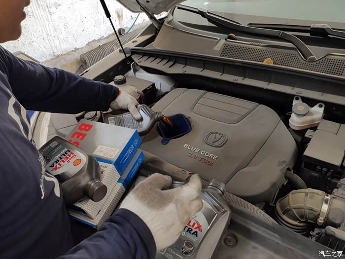 开始加机油了。这次买了5升,之前一直是买六升,但要浪费半桶,后来交流发现其实这车买五升机油就够了,全加进去油尺正好到达中线位置,刚好够用,加到油尺上线也没啥意义,毕竟这车不烧机油。