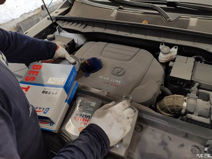 开始加机油了。灰壳5w-40,这次买了5升,之前一直是买六升,但要浪费半桶,后来交流发现其实这车买五升机油就够了,全加进去油尺正好到达中线位置,刚好够用,加到油尺上线也没啥意义,毕竟这车不烧机油。