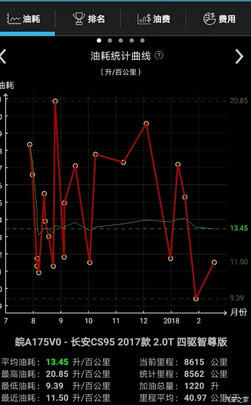 首先,我的油耗在众多车友中算高的,开车习惯的问题。小熊半年记录是13.45。后来没记录了。近期都是纯市区,有13的,有15的,也有18的