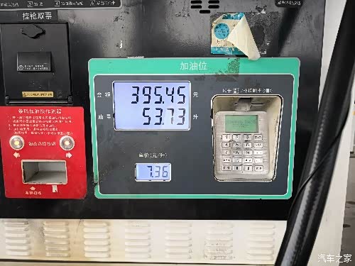 现在测算油箱。加了53.73,满了剩484,平均油耗刚好是10。灯刚亮是剩73公里,跑了17公里,显示剩60公里。
