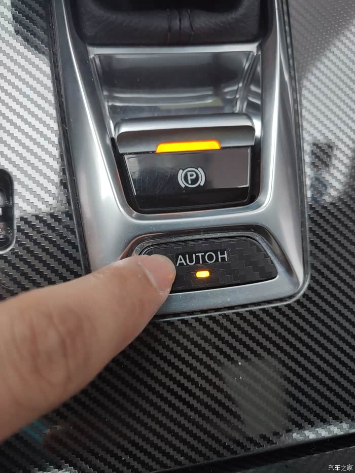 配合发动机启停使用的最佳搭档就是自动驻车,在电子手刹的后面,AUTOHOLD就是自动驻车,按一下提示灯亮启用,当你刹车踩到底就会启动自动驻车,这时候脚可以离开刹车,车辆会使用电子刹车辅助,解放右脚