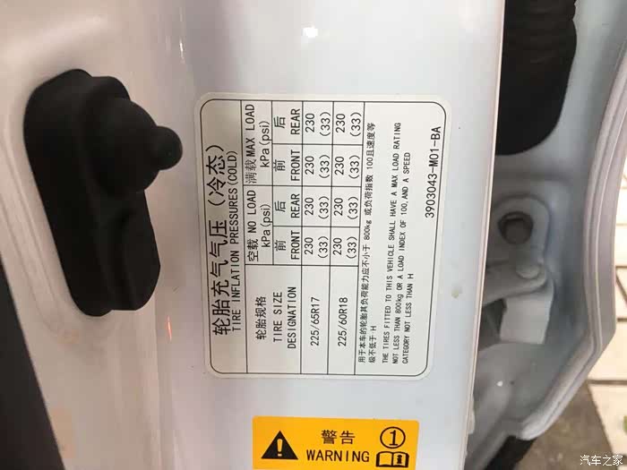 2-2:本人是长安CS75车型,车辆主驾驶的b柱下面都会有胎压的图示。不同的车型前后的胎压比例都不一样,有的是一致的,主要根据前后轮胎承受的重量不同,来规定胎压值。可以看到CS75车型前后的胎压值都是一样的,可以根据图标来给自己的爱车调整胎压。