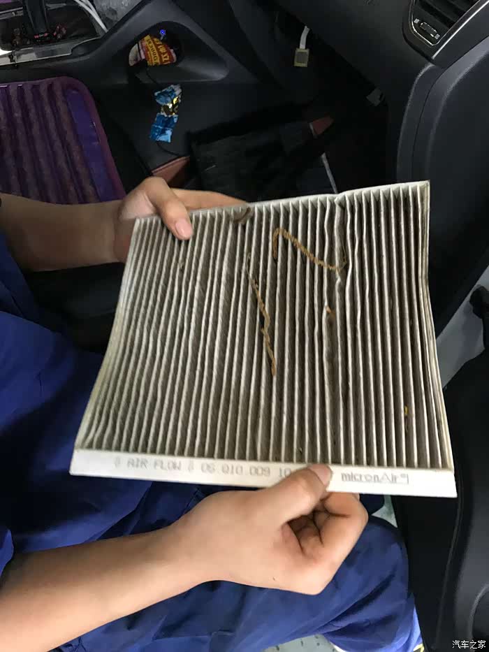 拆下的空调滤芯也是非常脏了,还有点受潮,难怪味道有点不对