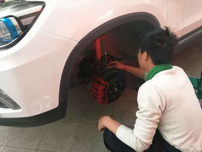 师傅在装左前悬挂相关的螺丝及配件。
