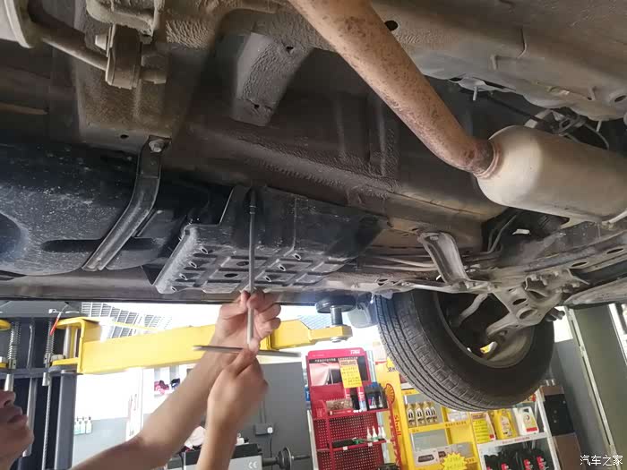 升起车身,更换机油过滤芯。