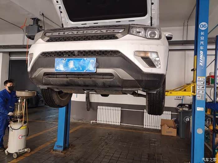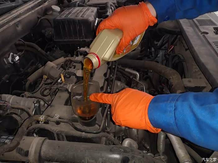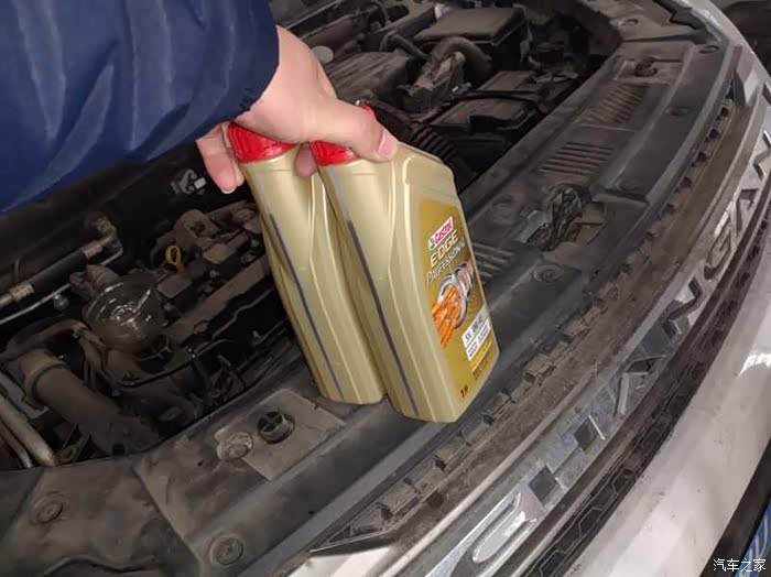 机油放完,机油滤更换完毕以后把75放下来,开始加入加油了,加机油之前完把准备好的发动机保护济加进去……