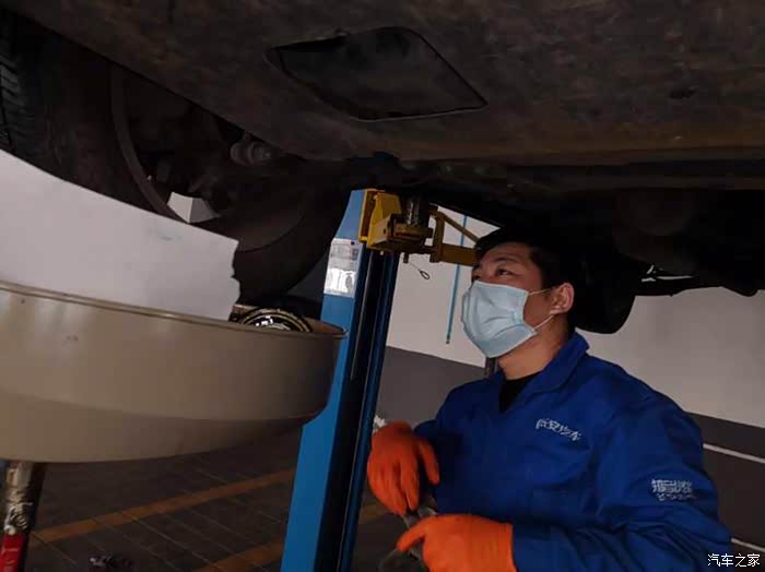 维修师傅用专车专用扳手把机油口的螺丝拧下来,注意看下螺丝的位置……