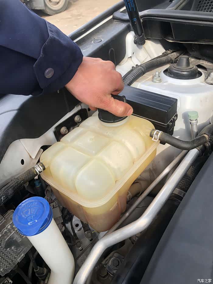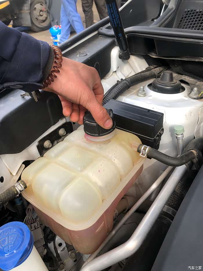 两人配合,一人上车轰油门,另一人观察防冻液的情况。