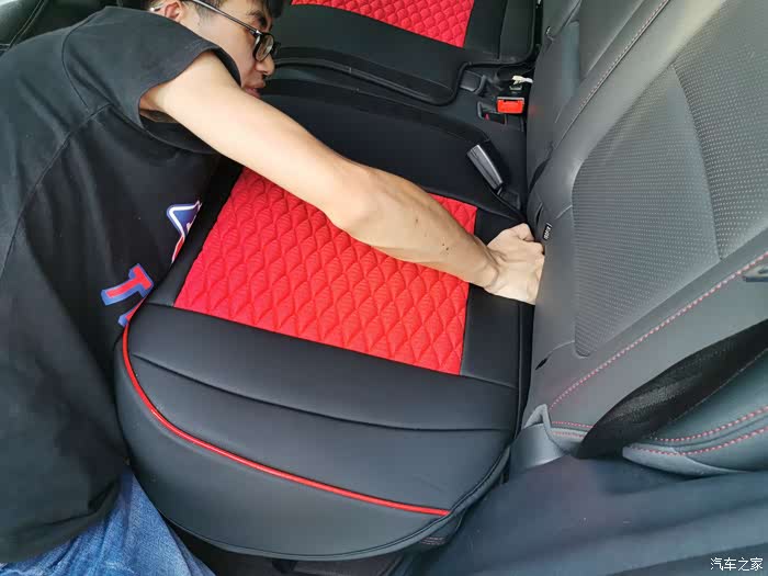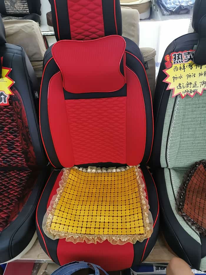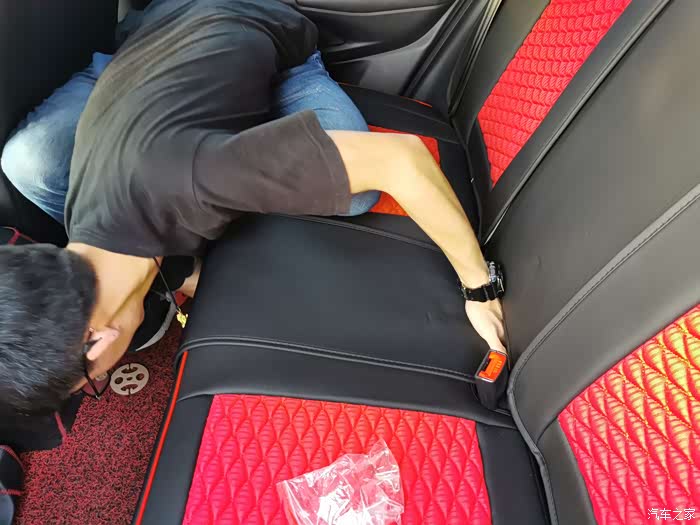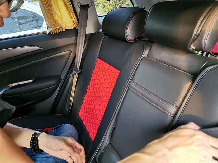 选来选去,选了这一套火焰红做一套,中间坐垫是棉质的,旁边是皮质的,皮质的手感很不错;中间坐着软绵绵的,非常舒服,而且这套座椅是全包围的,安装没有瑕疵又合缝;