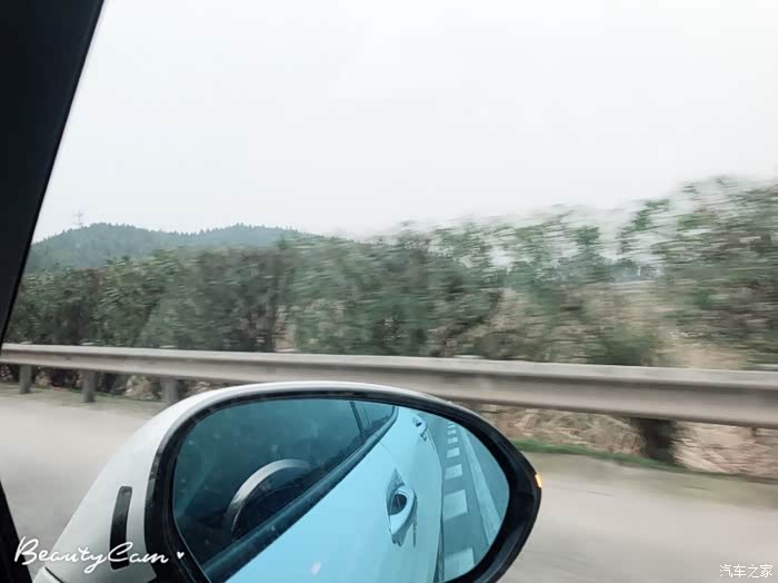 早早出发~后视镜里看侧身,我们特地给门把穿了件衣服,这个角度看别有一番感觉!
