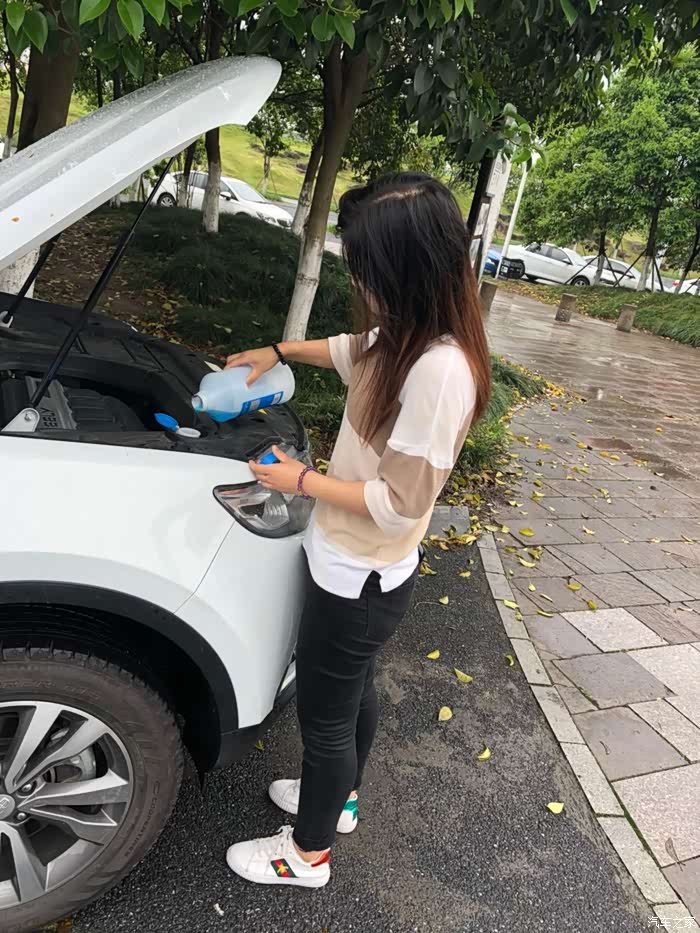 清洗的时候,发现玻璃水快没了,女神二话没说,直接拿了一瓶往里加