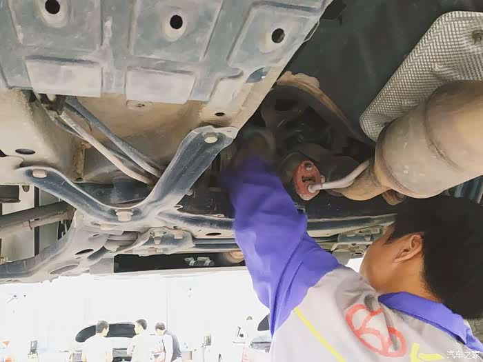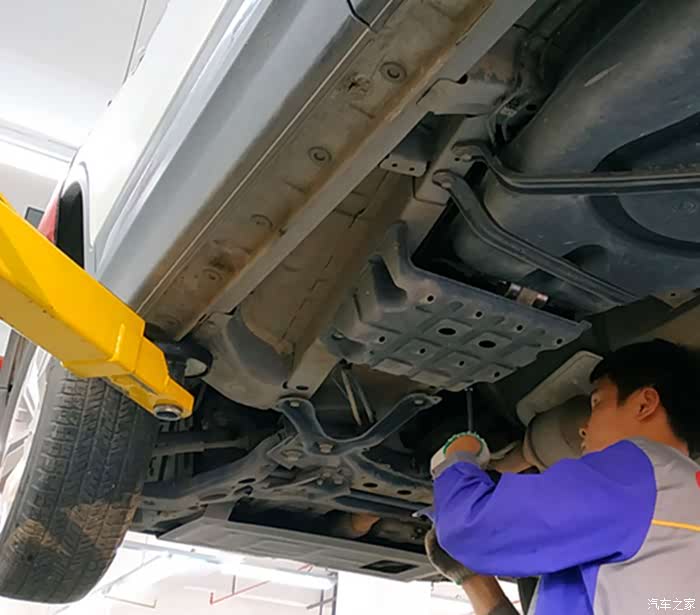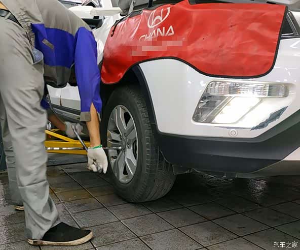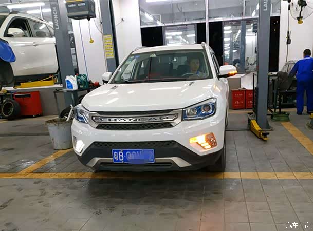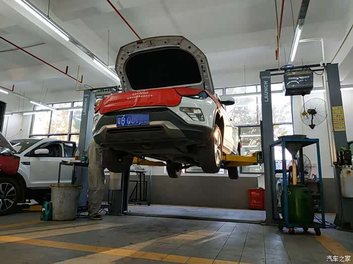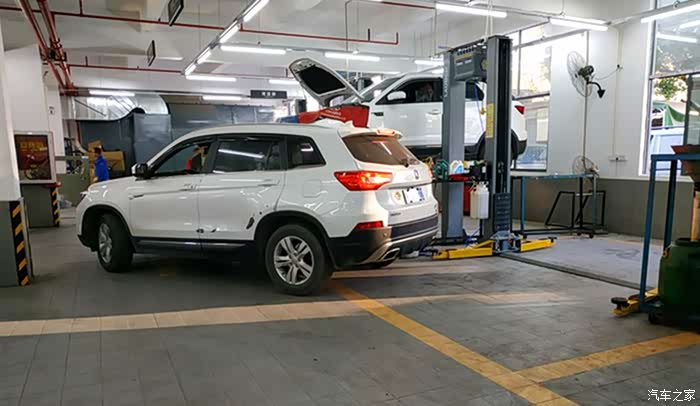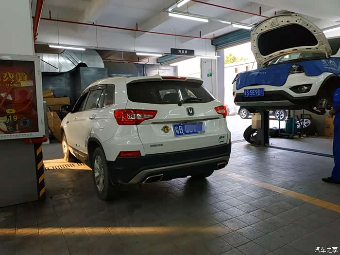 在4S店的客户休息区休息了一会儿后,再来到保养车间,正好看到保养师傅将我的CS75停入保养工位,准备开始保养了。
