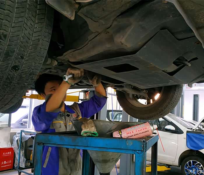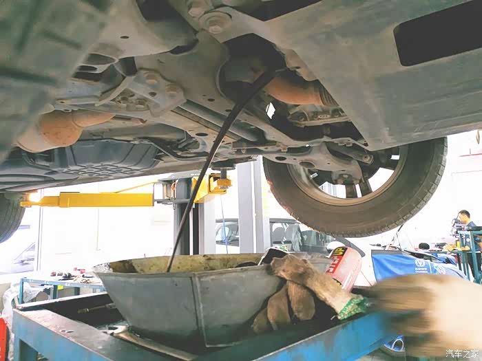 开始将发动机内的旧机油排放干净,这个过程需要几分钟。