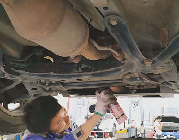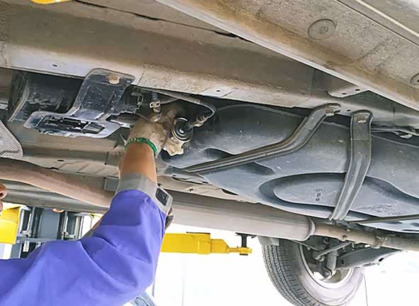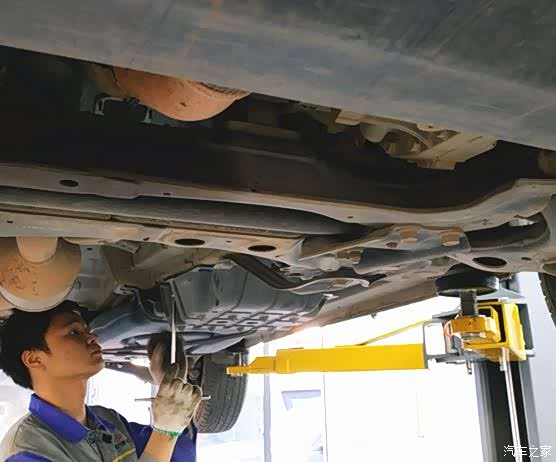保养师傅在拧开发动机排放机油的螺丝,准备先把发动机内的旧机油先排清。