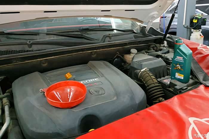 接下来将车子降下来,开始添加新的机油,因为是1.8T的发动机,所以需要4.5升的机油才够。先将这一瓶4升的全都倒进去。