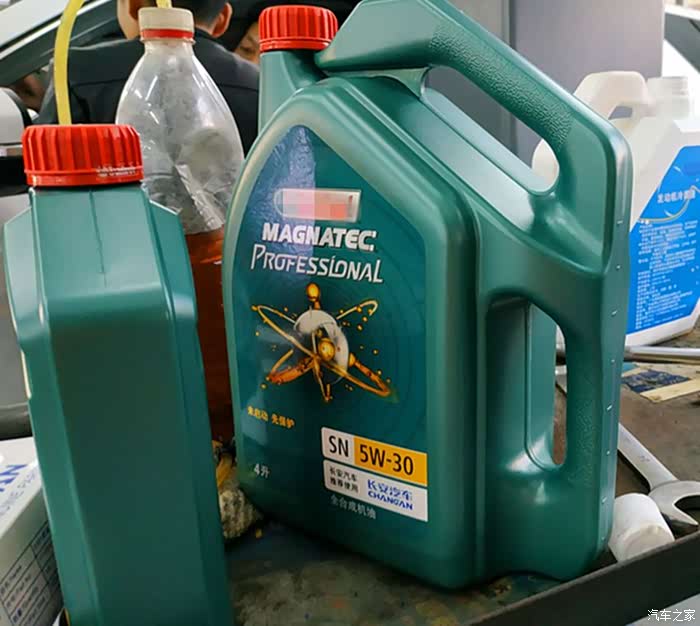 此次要用来更换的全合成机油已经准备好了,总共需要4.5升,所以是一大一小两瓶。