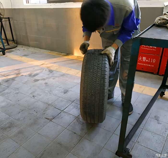 师傅在认真的逐个检查轮胎,看看是否有磨损得太利害,或者是有利物伤到轮胎的情况出现。