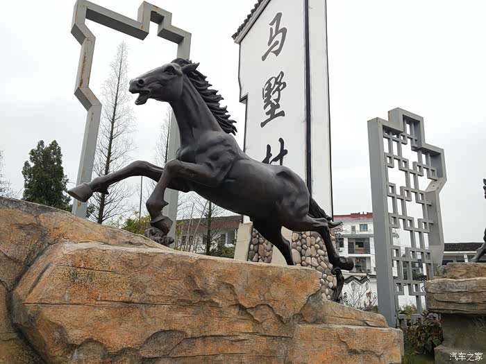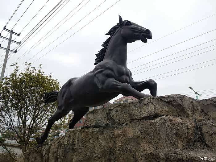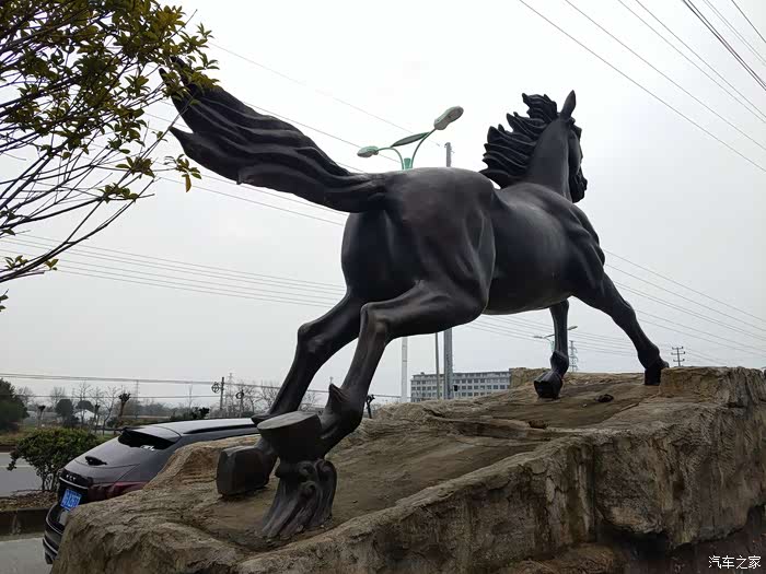在两匹奔腾的骏马前给爱车合照。
