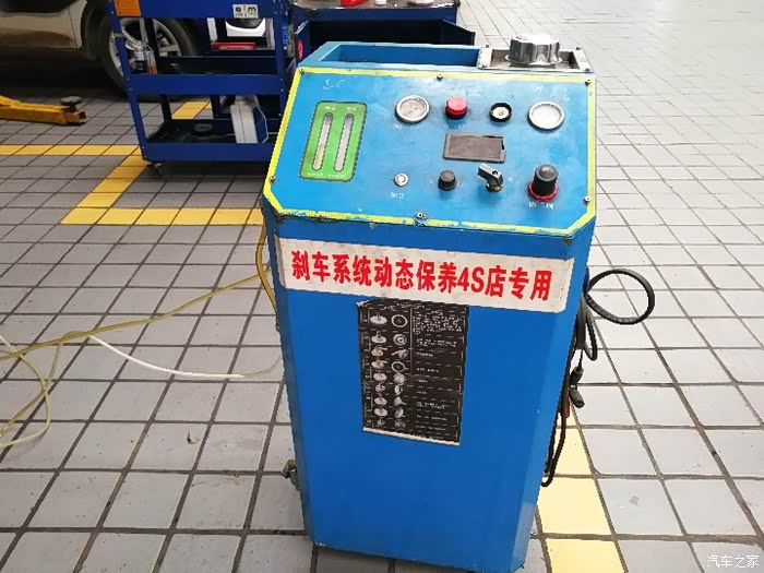 师傅推来机器,准备更换刹车油。