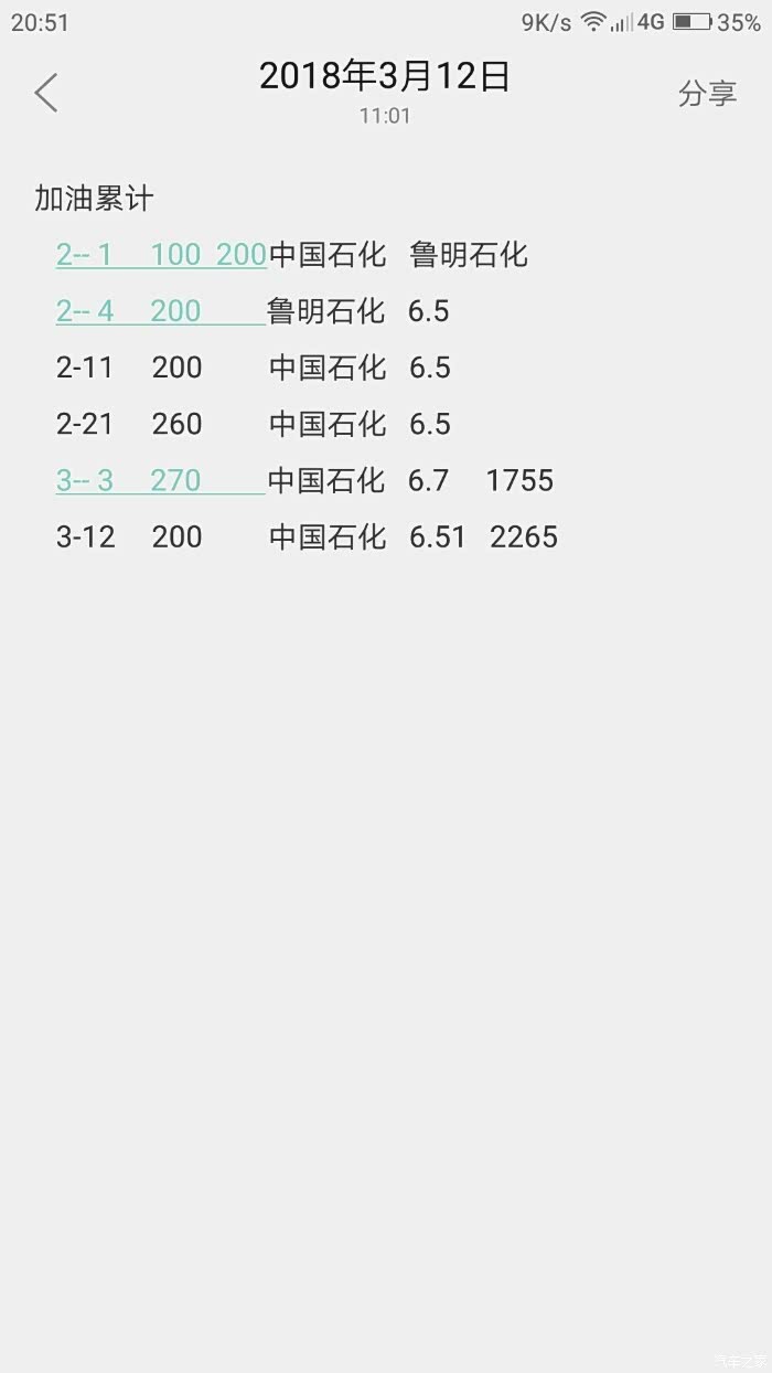 这是一直以来的加油累计,跑农村山路油耗还是挺高的,跑国道还可以比起朋友们的车要省一点,现在差不多两千五百公里的,表显续航里程还有三百多公里