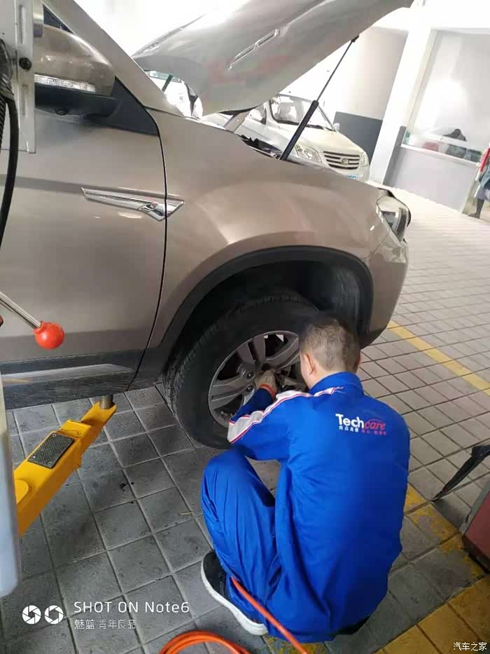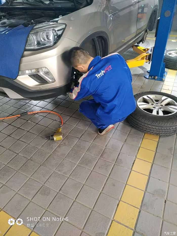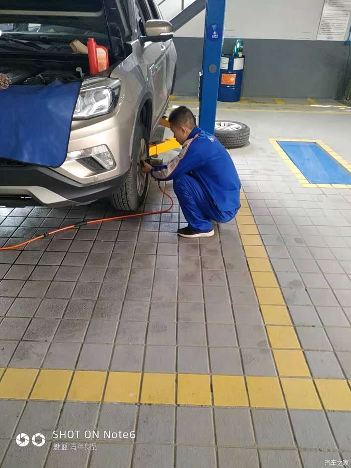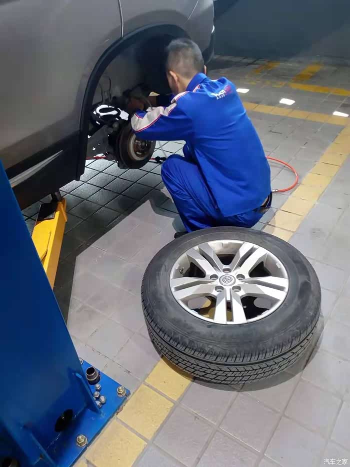 我正猜从哪放油的时候技师跑到后面去拆轮胎了。