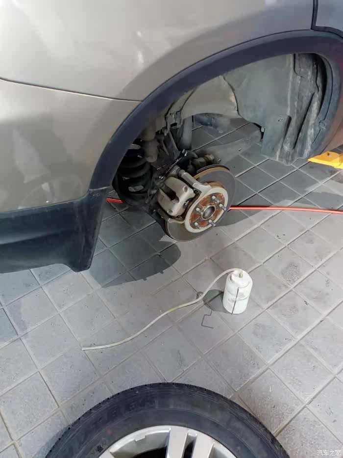 轮胎卸下来后拿来了一个带管小壶,并用扳手准备拆螺栓,难道说要把这个位置整个刹车系统都拆了才能放油?