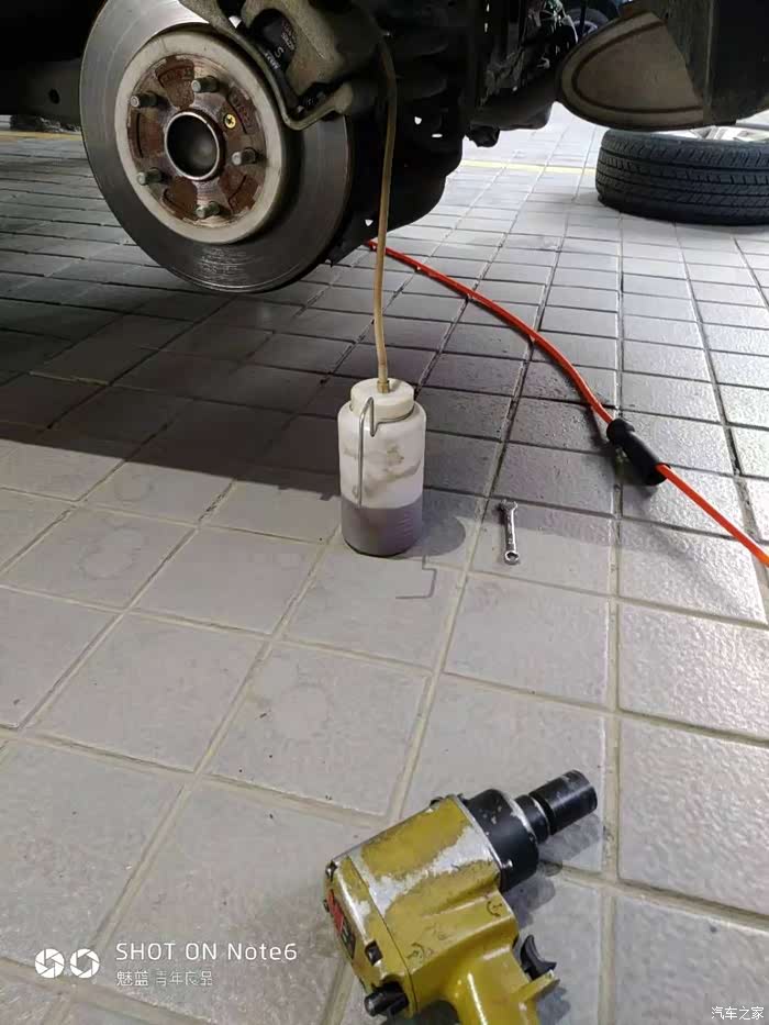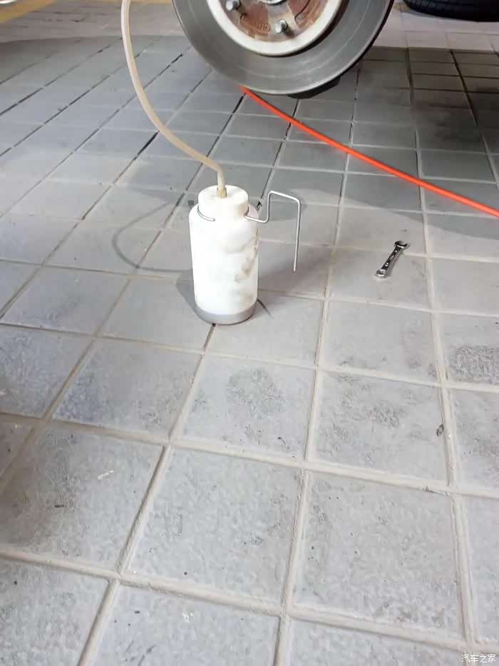 结果没有我想的那么复杂,后面有放油口螺栓拧松软管插上。也许是我太好奇了,这时就听技师喊踩我才注意到车里已经坐着另外一个技师正在努力的踩刹车,同时已经有油液通过软管进入到小壶。