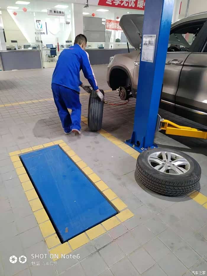 当拆最后左前轮的时候我和技师说:“既然四个轮胎都下来了,干脆把四个轮胎互换一下”。技师说:“你准备前后还是对角”。我选择了对角。其实这个事早就应该做了只是我一直嫌麻烦,这回算搭了个便车。