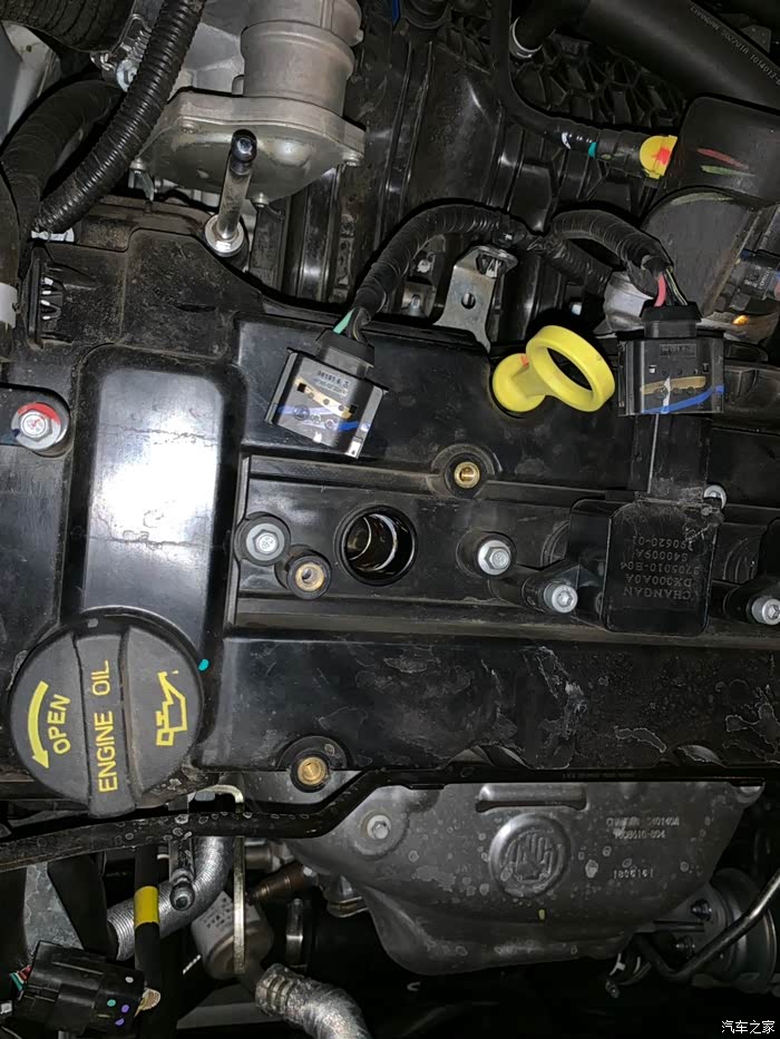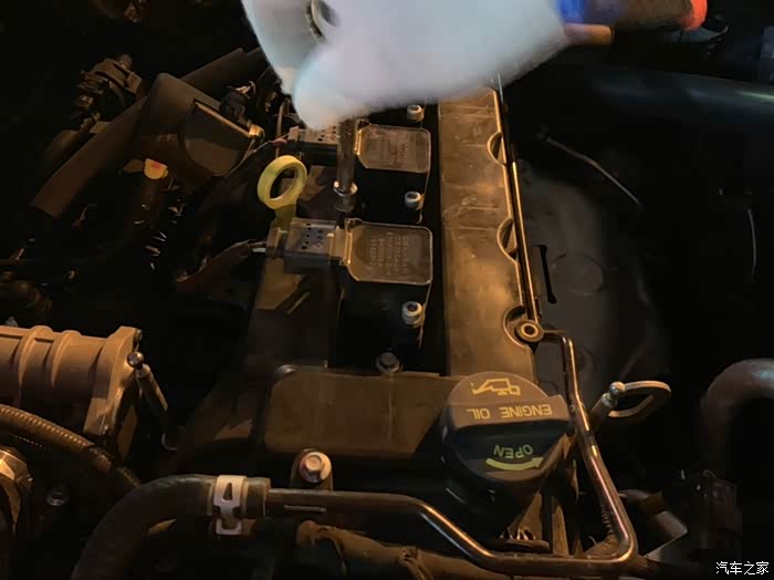 拆卸一缸火花塞,拆卸以后发动机的样子……同样的方式拆卸以后三个火花塞即可……