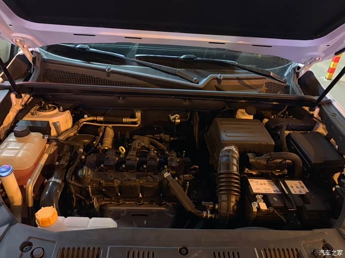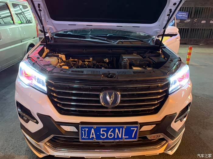 首先打开机器盖,卸下发动机装饰护板……护板非常坚固,里面还配有隔音棉……看护板中间的长安标志设计风格简约大方……