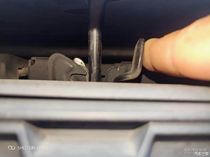 用中指向左拨动挂勾手柄,勾子脱离引擎盖锁,引擎盖锁脱离挂勾后用手背向上托起引擎盖,引擎盖已经完全开启