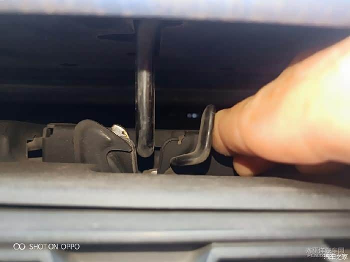 用中指拨开引擎盖挂勾,让引擎盖锁完全脱离挂勾后,用手背用力把引擎盖向上托起,由于引擎盖设计是液压起动的,所以不用太大力气,而且升起后引擎盖不用其他东西支撑住。可以完全放心引擎盖压下来。