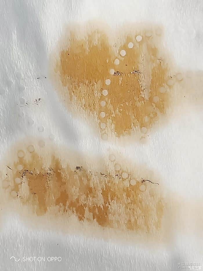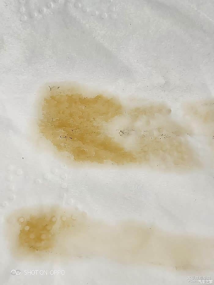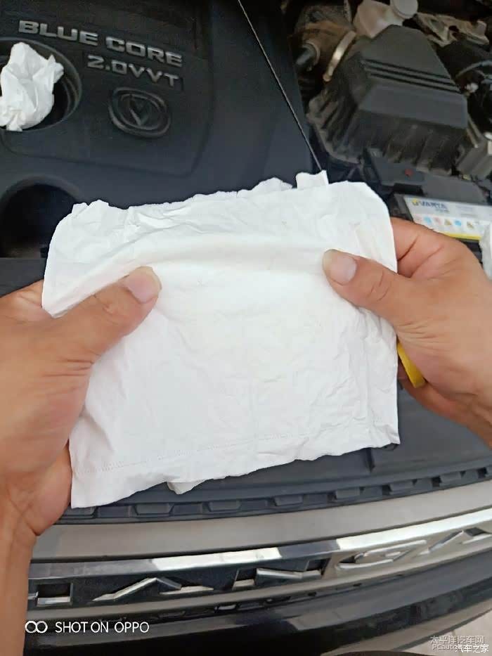 我怕刚才油标尺上粘上来的是沉淀好几天了机油,所以又把油标尺重新插入发动机里,然后再次让油标尺粘住机油,再次放在餐巾纸上面测试。