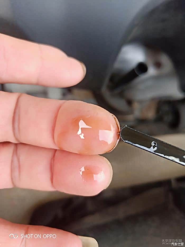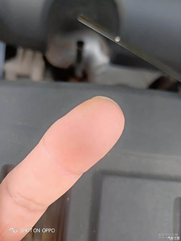 把手指擦干净,然后再把油标尺放入发动机重新粘上机油,把粘上的机油放在左手食指上,把机油尺轻轻拖到,让机油完全粘在手指上再查看机油的颜色,我觉得粘在手指上的机油不是很黑。第六步:用大母指和食指测试机油的粘度。