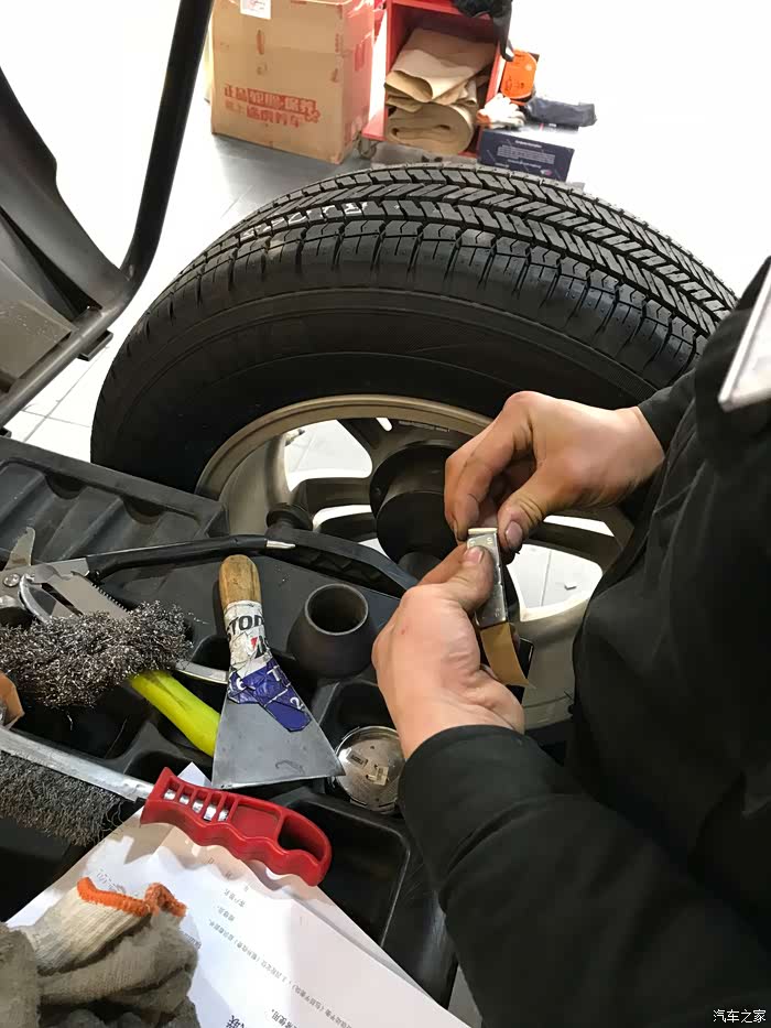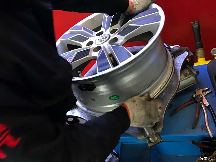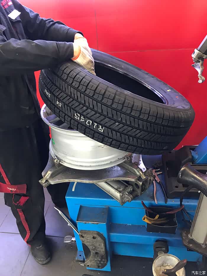 安装师傅手法娴熟,不一会就把前面两个胎卸下来了