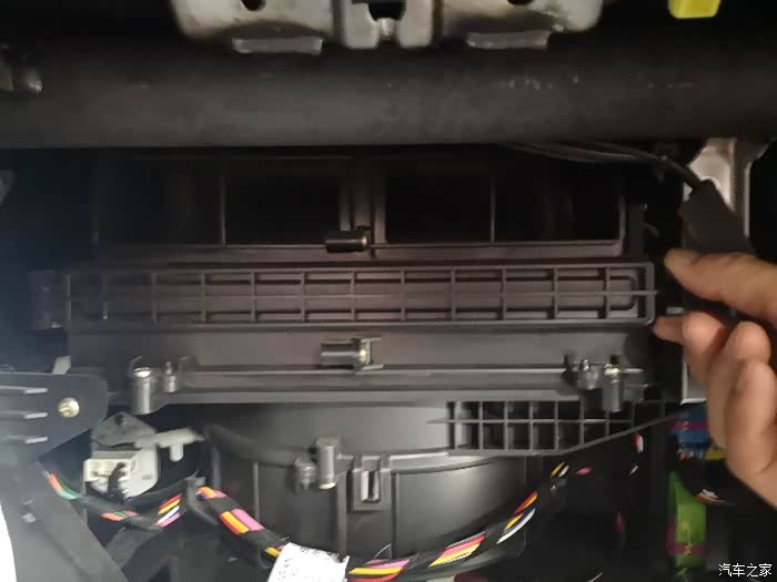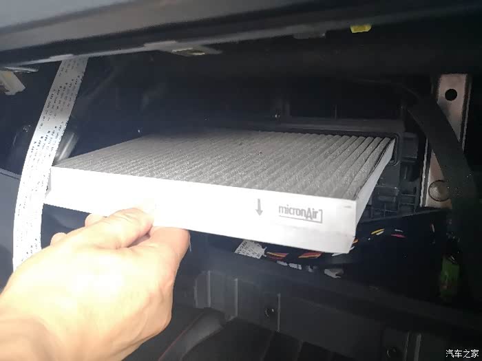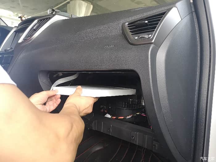 取下空调滤芯盖板,把旧的空调滤芯取出。