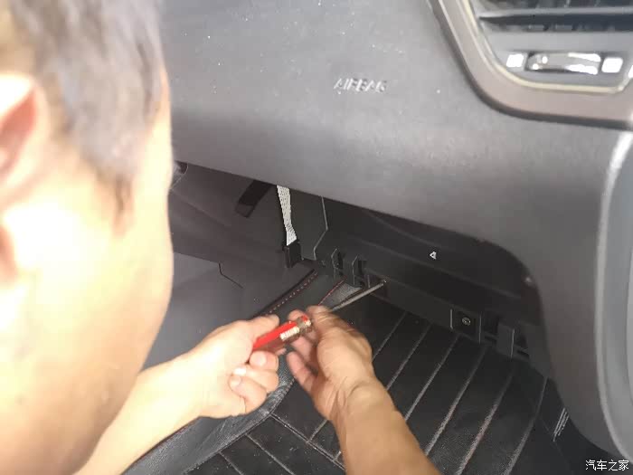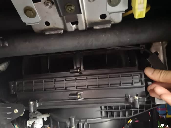 这就是空调滤芯盖板,右边有一个卡子,轻轻一按,空调滤芯盖也取掉。