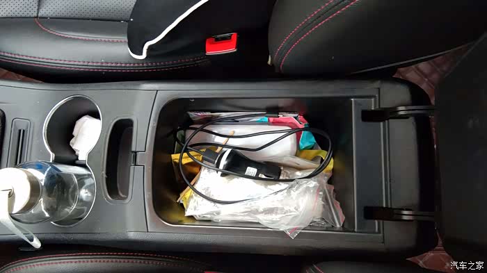 打开扶手箱是一个储物格,内部空间也很大平时放些数据线