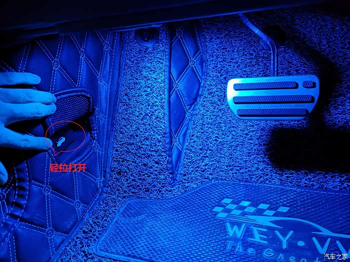 首先从主驾驶下方找到红圈处的发动机盖按钮,轻拉打开