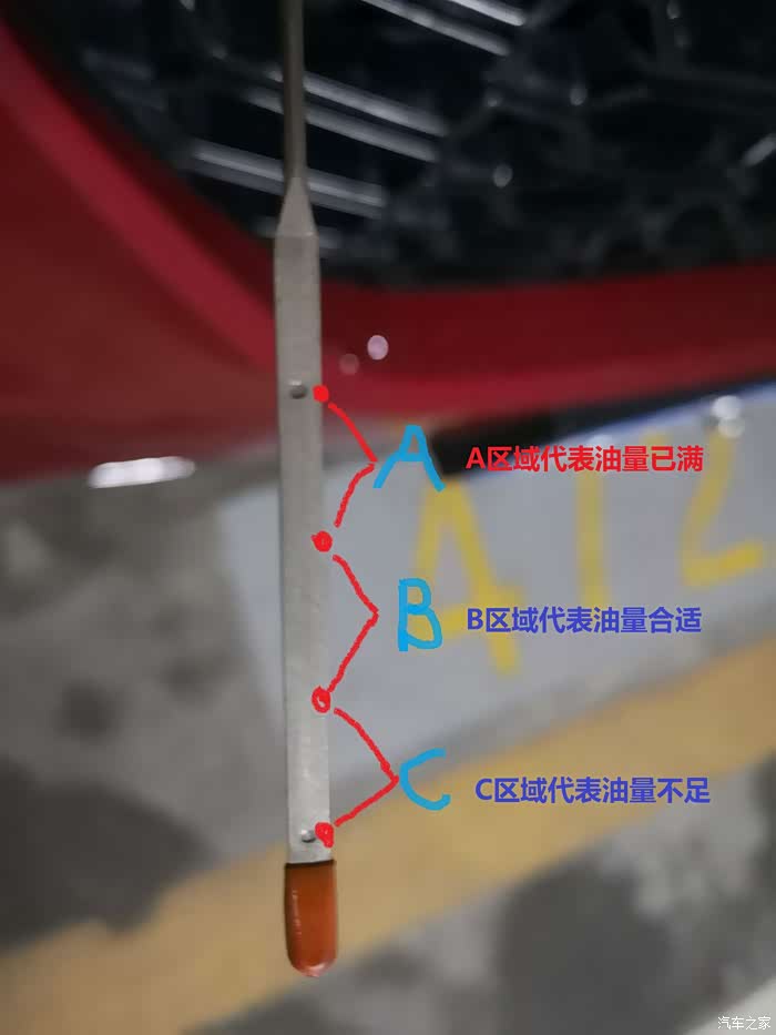 C区域代表油量不足,需要加机油,加到B或A区域