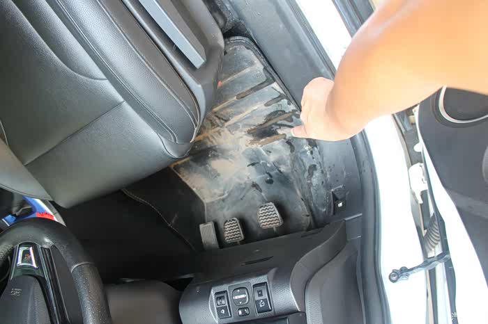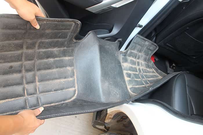 小心翼翼的将原车脚垫抽出,不能把泥块抖落在车里。