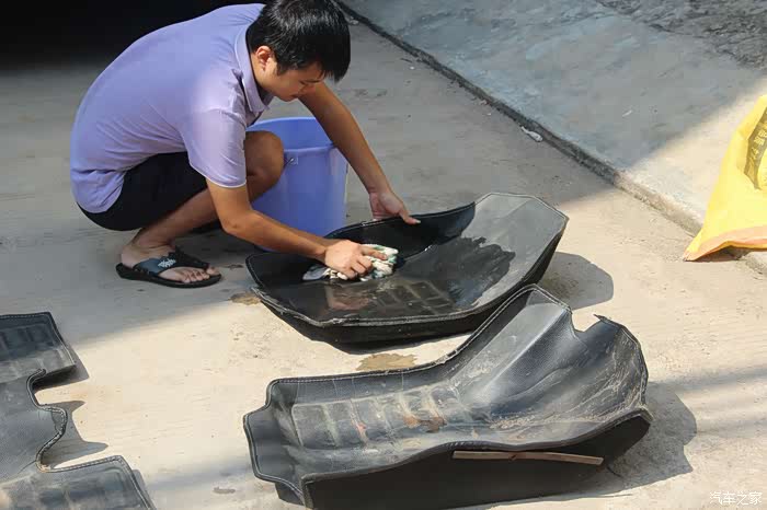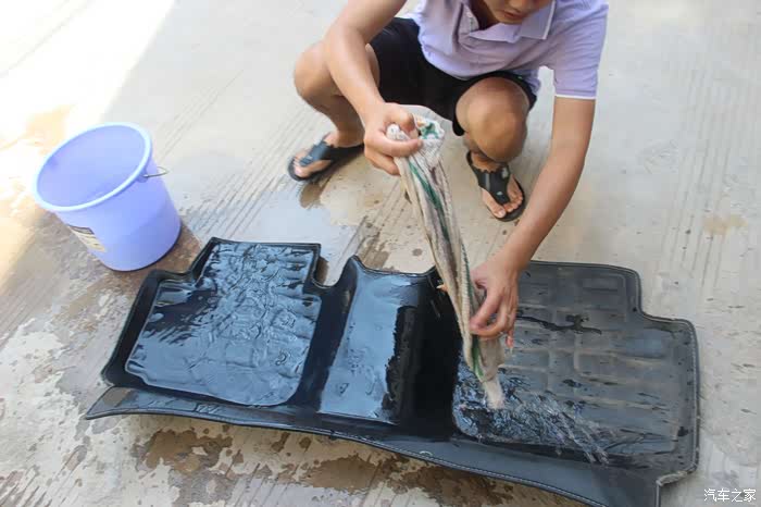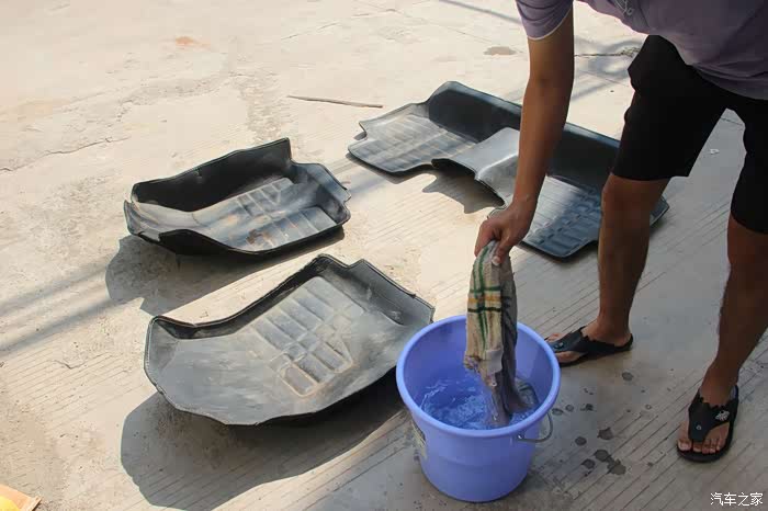 打了桶水,给原车脚垫清洁一番。