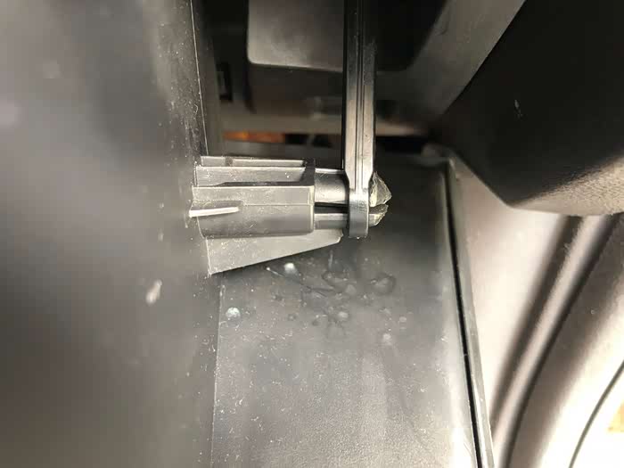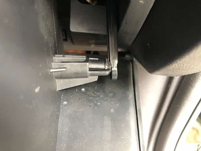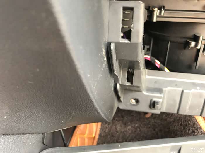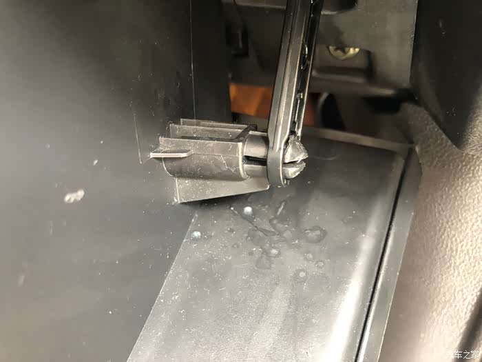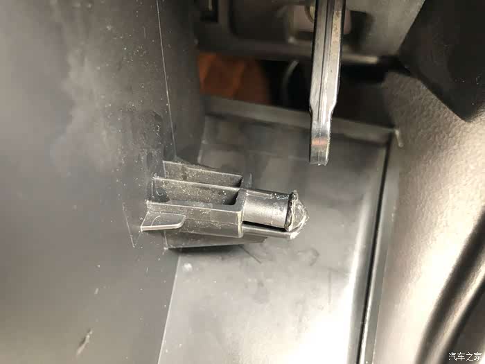 阻尼杆是连着手套箱一起的,第一次我不小心用老虎钳夹出来,结果坏了,现在自己用胶水粘牢了,这次我必须非常小心的拆了,其实不用老虎钳只要手里劲大一点就能拔出来。