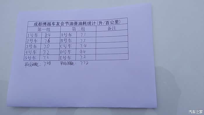最终两个小组油耗统计表,第一组中石化组7.48个油,第二组中石油组7.72个油,这么看起来中石化的油似乎比中石油经烧一些。另一个情况就是整体来看,绝大部分车友的油耗在同样的路况,同样的里程下,油耗数值相差不大。
