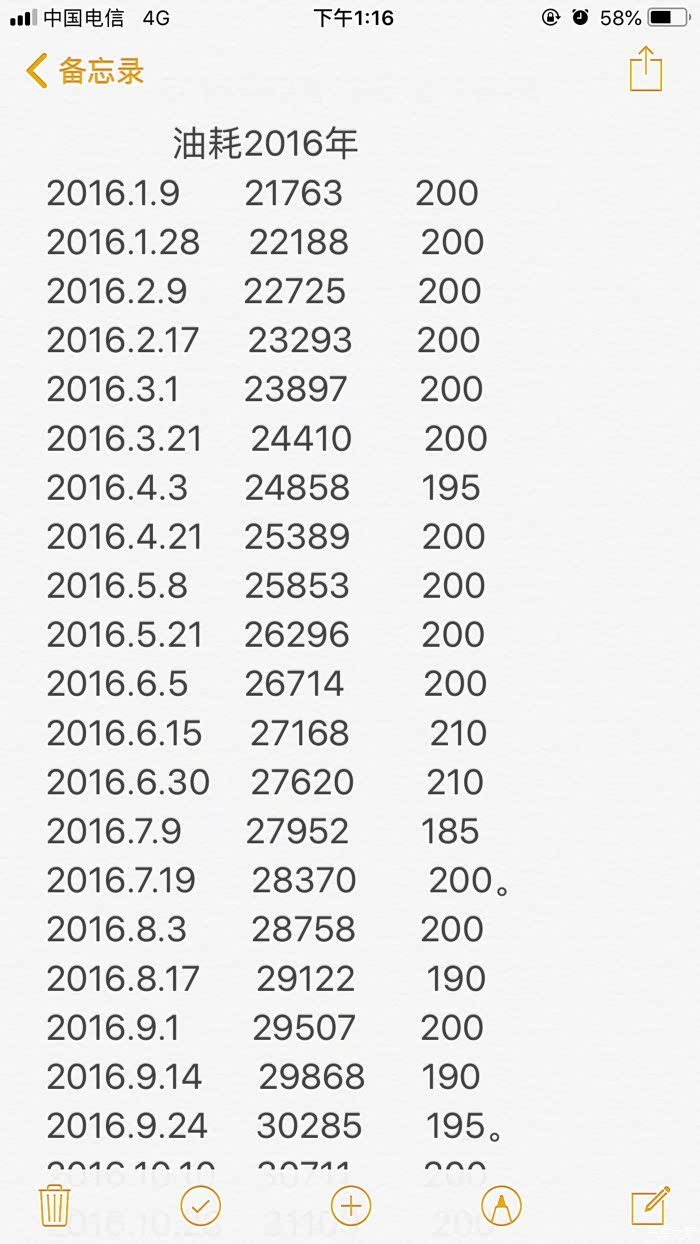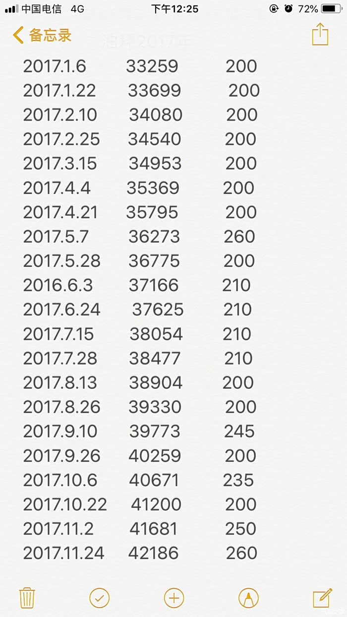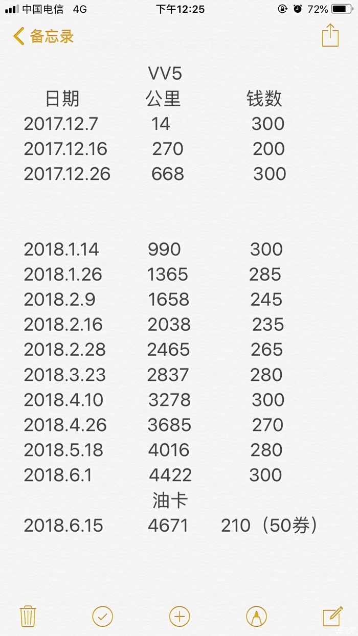 这是小五每次加油的记录,可以看出,平均下来基本一个月加两次油,每次300左右。总共加了3820块钱油,跑了5032公里,剩余16升油。具体百公里多少油耗,一公里多少钱,也懒得算了,油价也总在变化,我只看加多少油,跑多少路就行了。