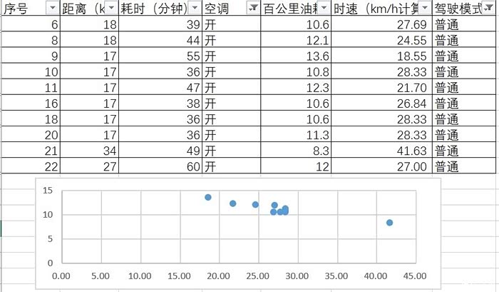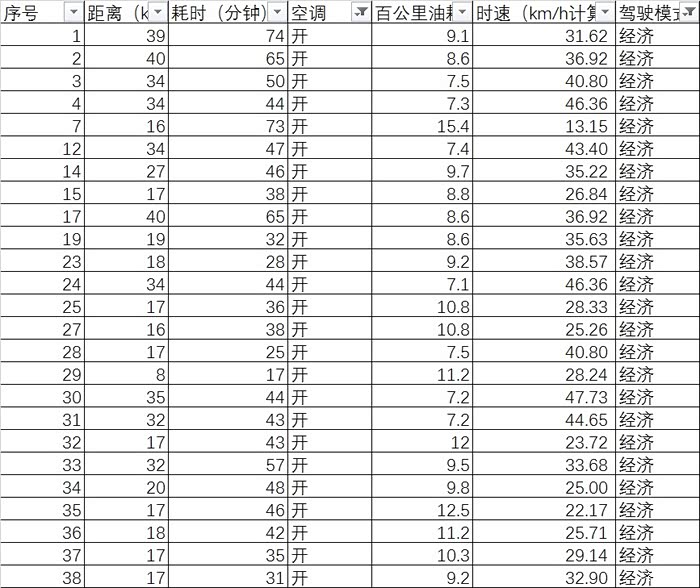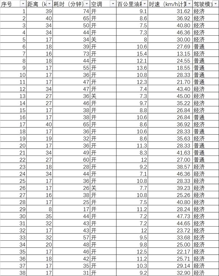 自己做了一个表格,挑选了一些距离相对长一些的记录了每次的平均油耗(还是软件里面的),不管准不准吧,我觉得计算标准是统一的,还是有参考价值的,简单做了一些计算,油耗和时速的关系还是很密切的,另外和经济模式和普通模式关系也很大,普通模式真的很费油,还有就是开不开空调也停影响的。