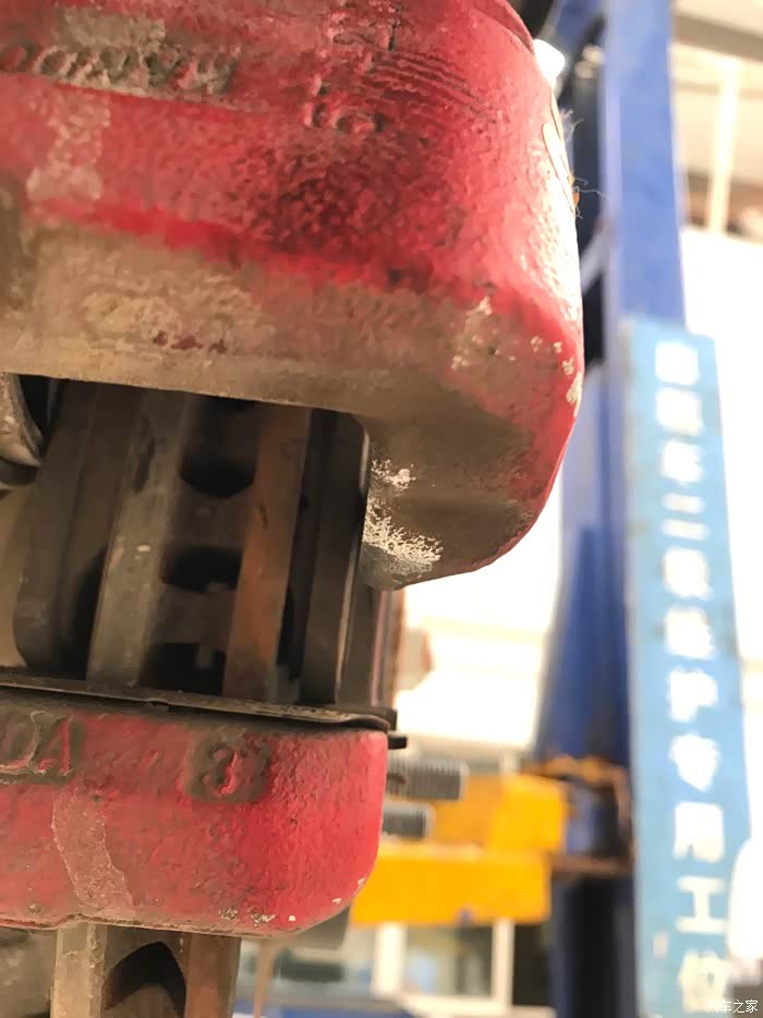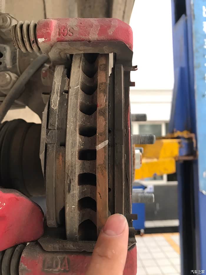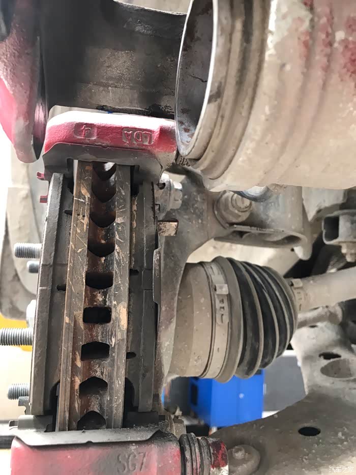 拆开轮胎我检查发现左前外面刹车片磨损异常,向技师反应他们说刹车分泵有问题,需要更换