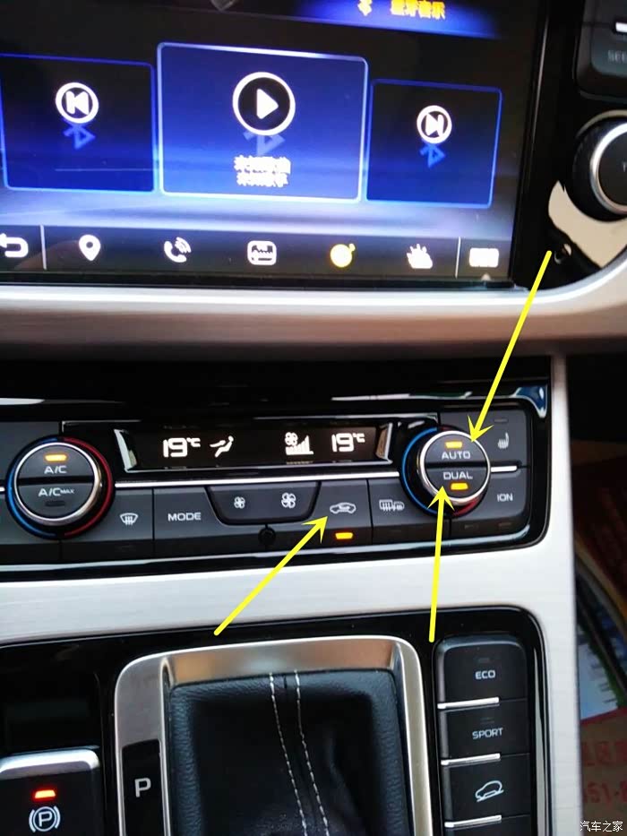 AUTO按钮下面的DUAL按钮是双区控制按键,按下点亮,空调工作在双区模式,再次按下,指示灯熄灭,空调会工作在单区模式