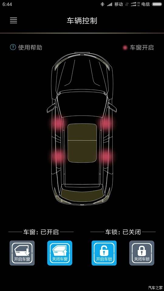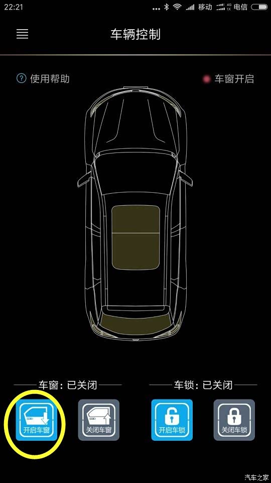 遥控器开启车窗门是受距离限制的,在遥控器够不着的地方,下面这个小方法就显得很重要了。如下图所示,用手机控制车窗,打开软件,车辆控制